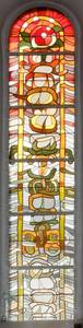 Ein erster Blick in die Kirche lenkt das Auge auf das bunte Fenster im Chor. Die floral wirkenden Formen interpretien das Sämannsgleichnis (Matthäus 13). Es wurde 1974 von dem Künstler Horst Leyendecker entworfen.